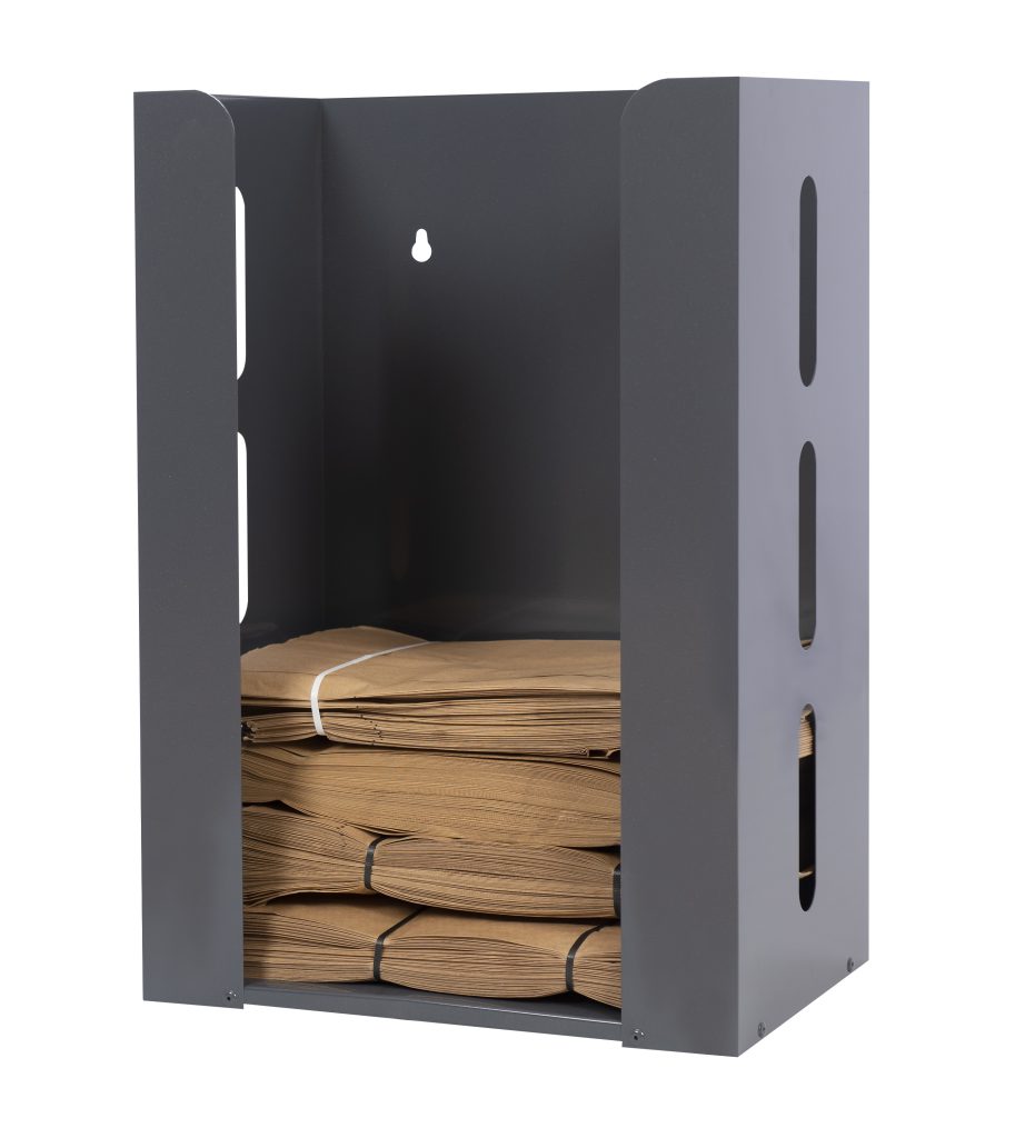 Käytännöllinen seinäkaappi, johon mahtuu 12 nippua, jokaisessa 80 pussia. Helppo asentaa seinälle ja pitää pussit järjestyksessä sekä helposti saatavilla. Soveltuu sisäkäyttöön, esimerkiksi jätehuoneisiin, varastoihin tai muihin yhteisiin tiloihin.